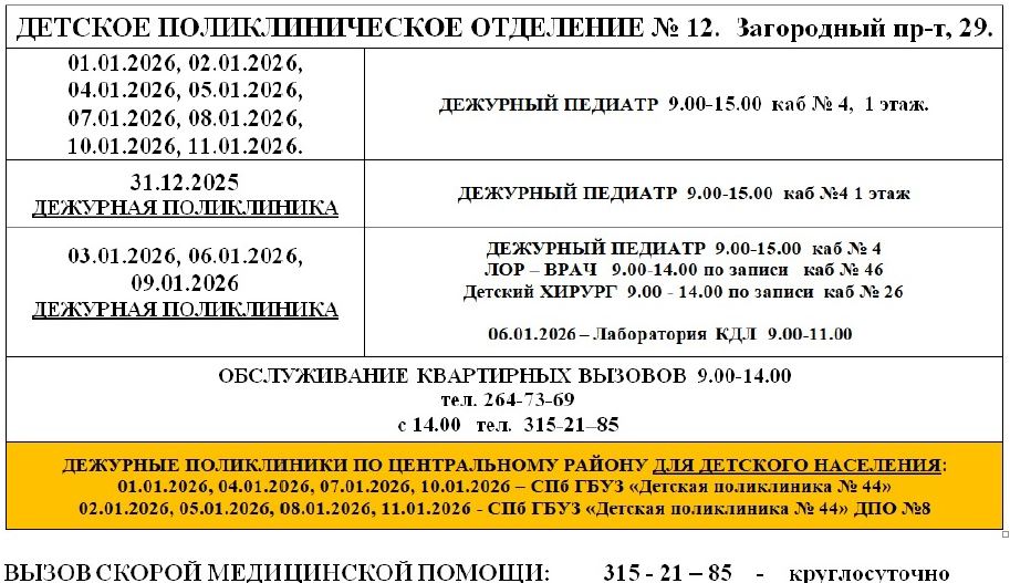 РЕЖИМ РАБОТЫ СПб ГБУЗ «ПОЛИКЛИНИКА № 37» с 31.12.2025 по 11.01.2026 года