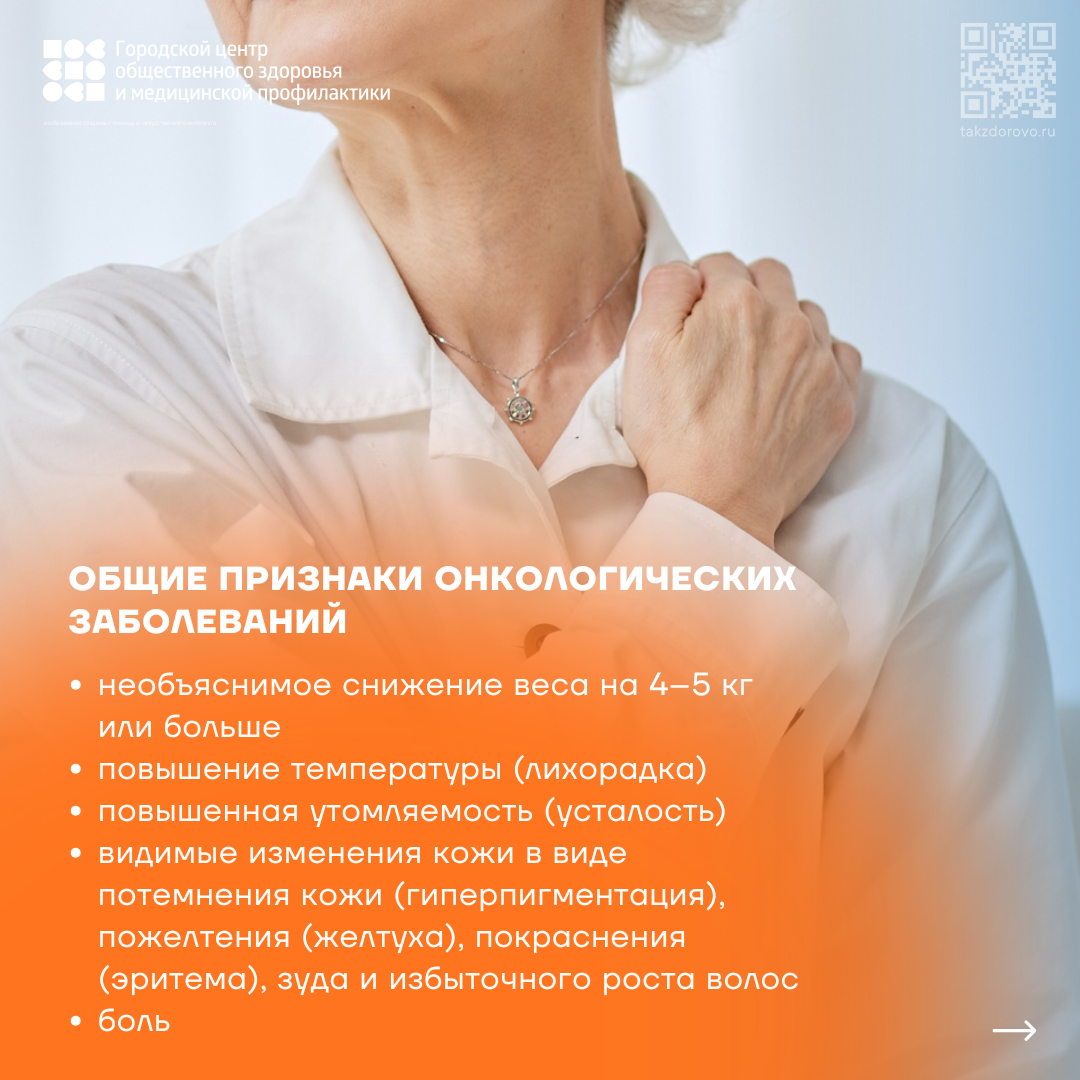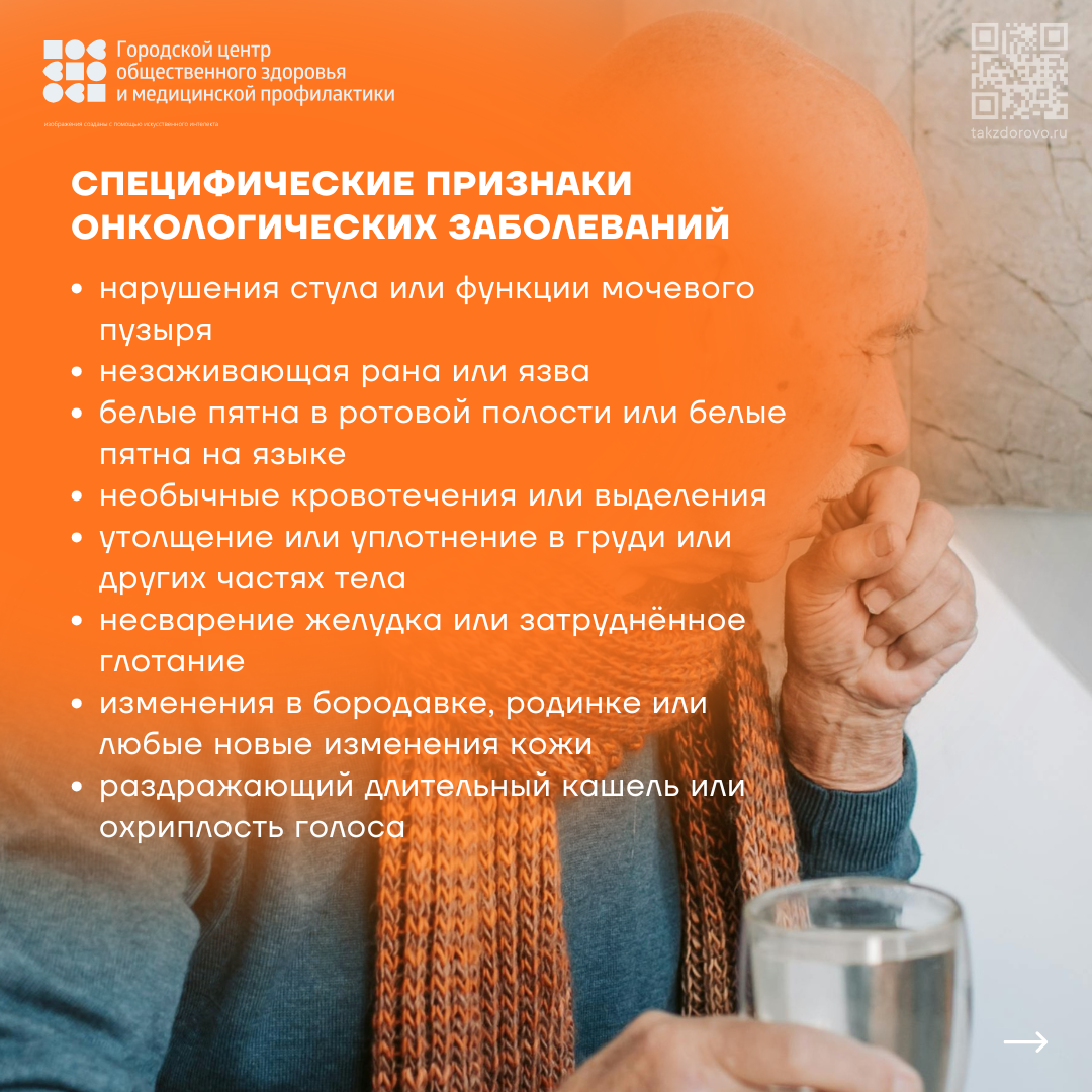 - настороженность: симптомы рака неспецифичны и зависят от типа опухоли, но общие признаки включают необоснованную потерю веса постоянную усталость, лихорадку, ночную потливость, появление уплотнений или шишек, длительный кашель, кровь в моче/кале/мокроте, изменение родинок, незаживающие язвы, увеличение лимфоузлов, нарушение стула/мочеиспускания, боль, которая не проходит или усиливается, особенно ночью;